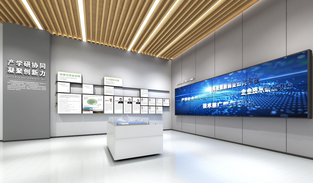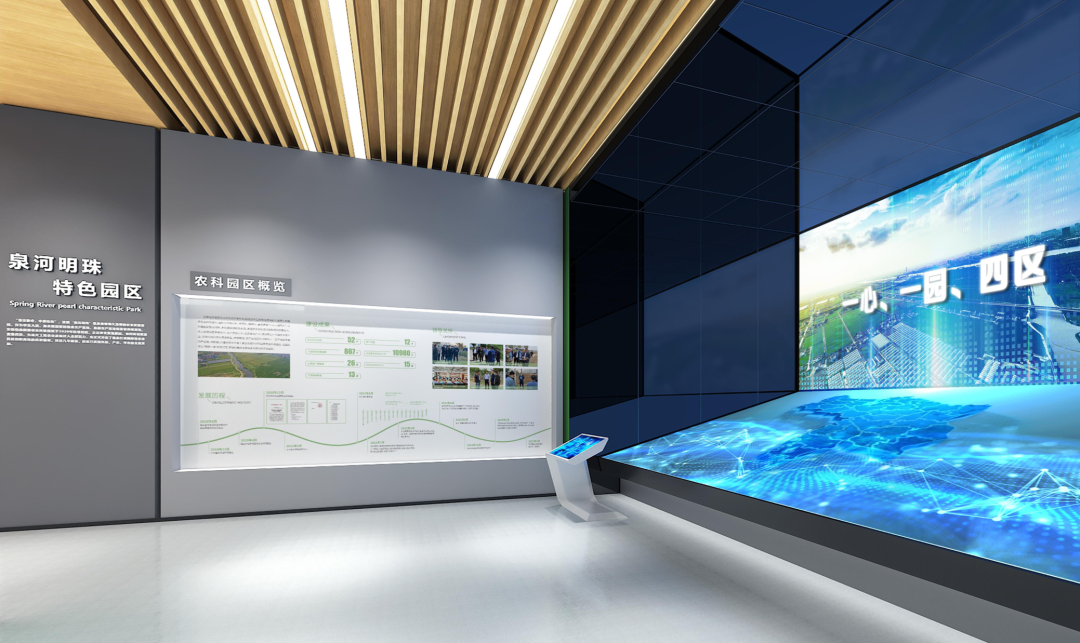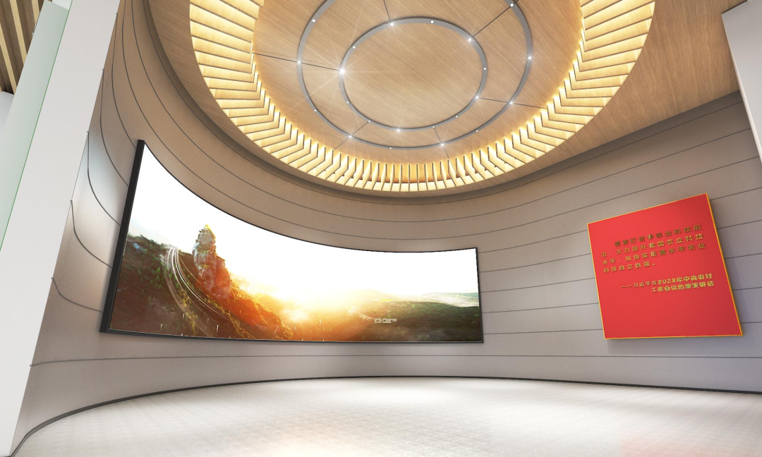 三森集團在設計展陳方案時,重點置于將農業創新成果名片化、亮點化。為了更好地服務于成果展示,在分析場館現有空間形狀后,對參觀動線與空間調性進行合理化的設計與調整,同時利用立體實景沙盤、L幕數字沙盤、LED弧形屏、互動抽拉式卡片、拼接屏、投影場景還原等多種形式的屏顯效果打造亮點空間。用一座“智慧科技、生態農業”的特色農業科技展廳最大可能還原農業新景,助力我國現代化農業創新,推動全國農業走向世界農業科技前沿。