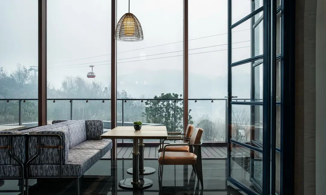 相比冷峻迷幻的大堂空間,YANG為大堂吧賦予了更多的溫情。棕褐木質地面、象牙白暗紋呢沙發、復古暖光的垂吊礦燈……熊熊熾熱的篝火,暈出黃昏的朦朧輪廓。窗外水簾慵懶地哼吟石間,歲月緩緩沉淀,邀你慢下來。