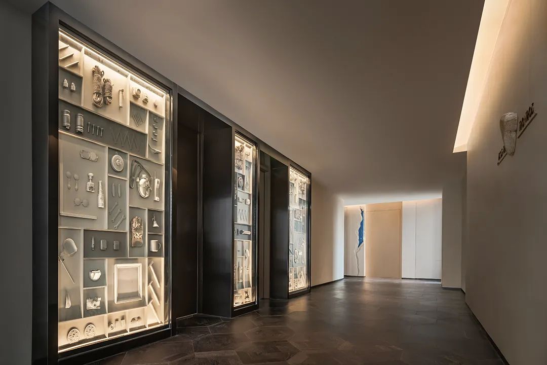 當大地側了個身,將山河走向、地質肌理坦露于墻,送來城市生長變遷的信息,你會不自覺沉迷靜思。常規的宴會電梯廳前,YANG別出心裁引入地形圖譜,激發驚喜。