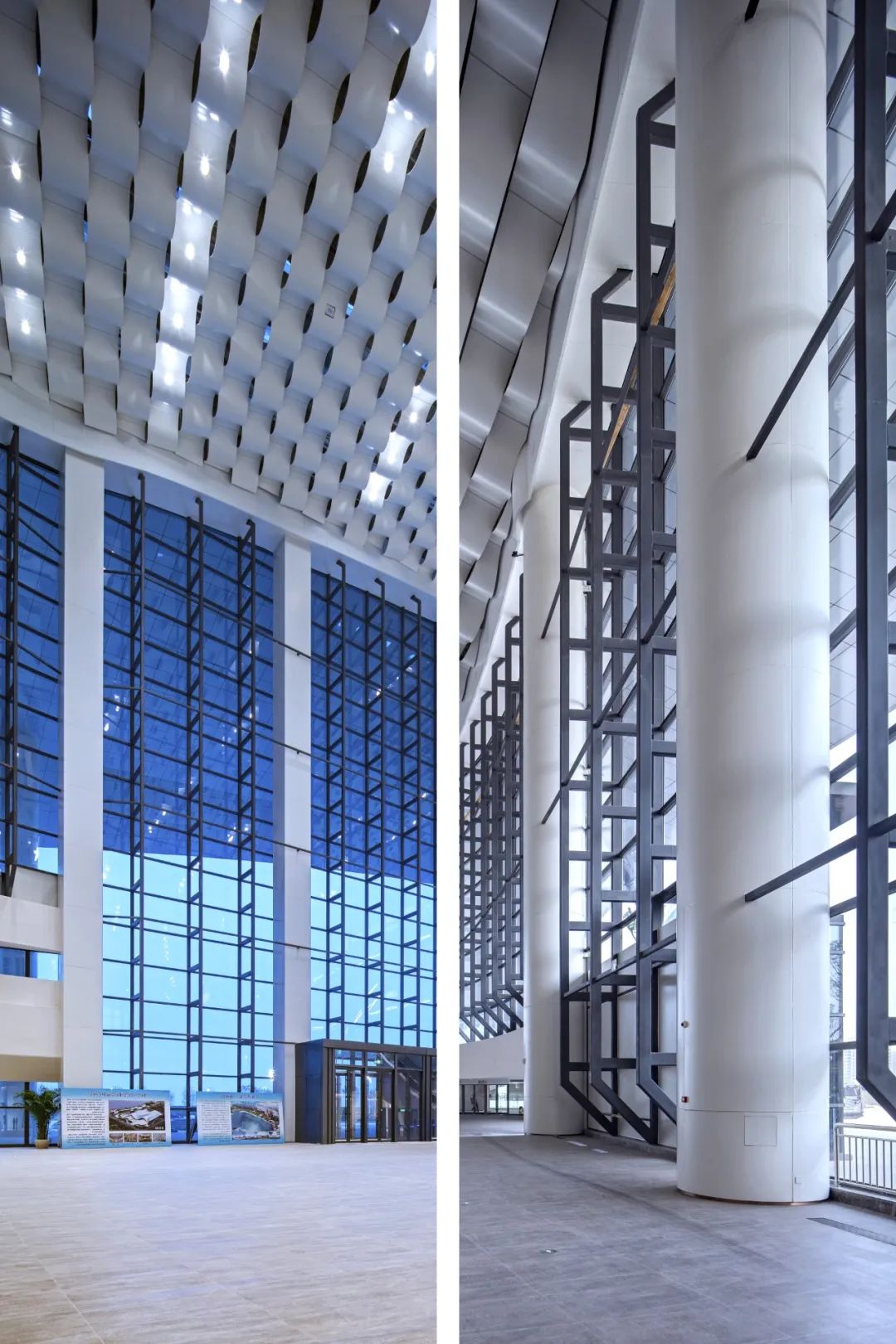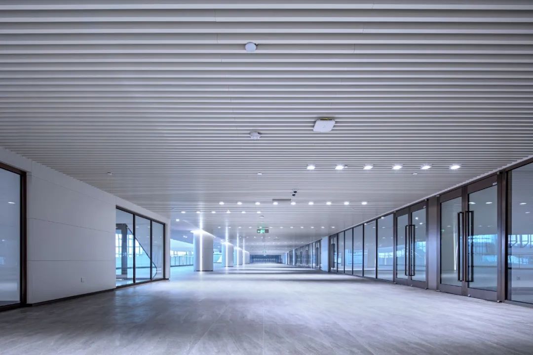 走進門廳,一股簡潔明快、清新大方的現代之風撲面而來。站在高大寬闊的大廳前,人顯得如此渺小。放眼望去,無論是那充滿海浪流動感的四層樓裙,還是那連綿起伏、波瀾涌動的波浪形吊頂,亦或是那鑲嵌在波浪之中宛如明珠般的點點燈光,都讓人有一種身臨浩瀚大海之感。主登錄廳也是整個會展中心最具特色、最核心、最重要的區域之一。