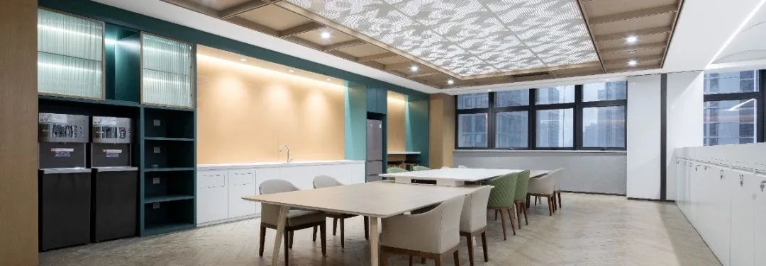 休息區(qū)、茶水間的整體視覺由大色塊拼合而成,莫蘭迪色系墻面過渡自然,呈現(xiàn)大氣而純粹的精致美感;地面木紋磚則采用人字型鋪貼,錯落有致的排列讓木地板更加靈巧生動,使空間更富延展性。