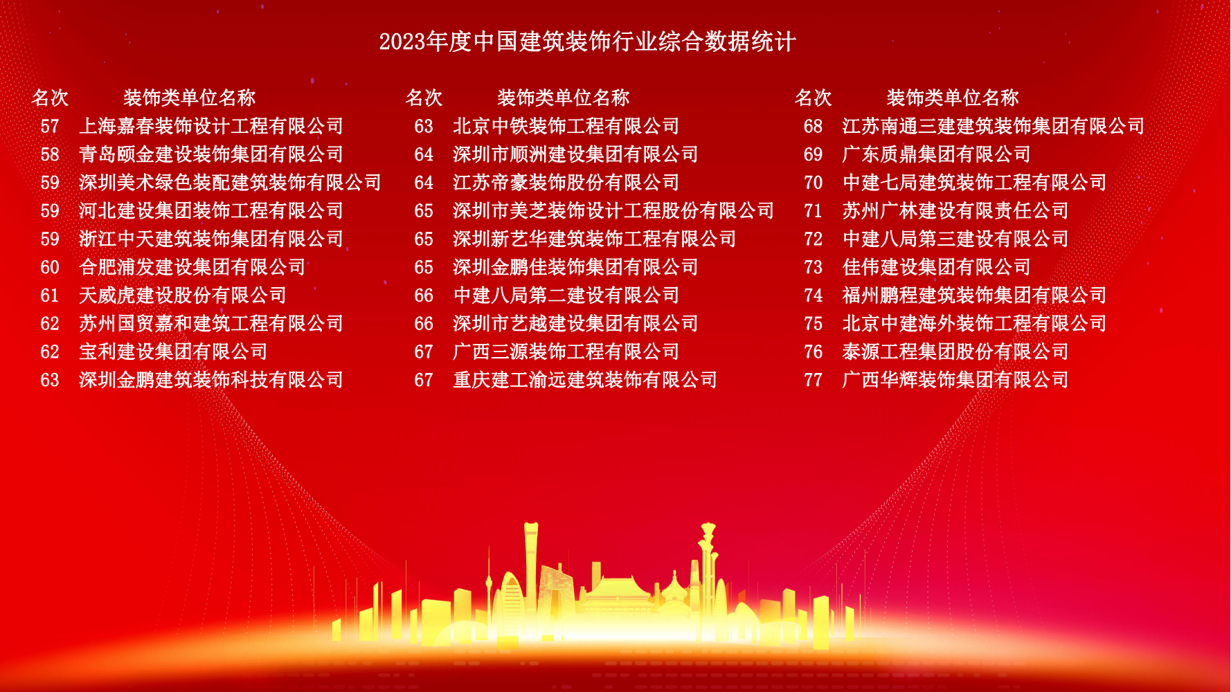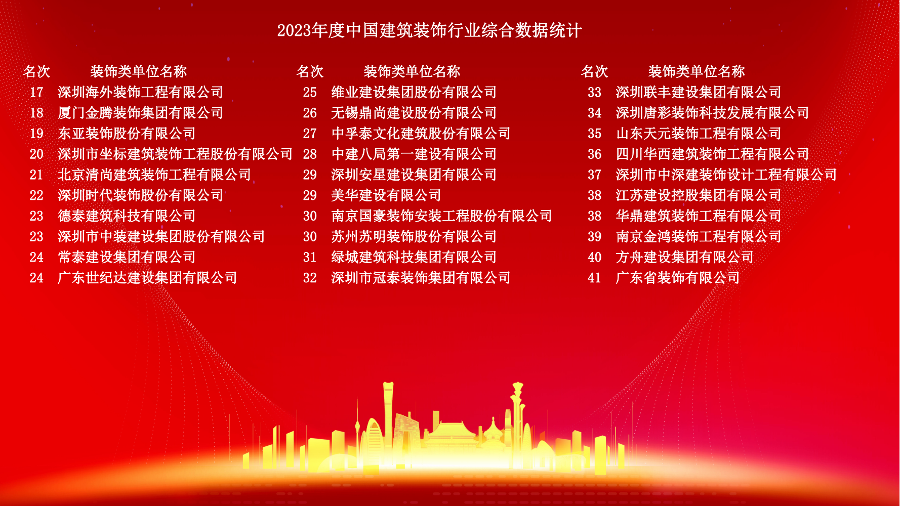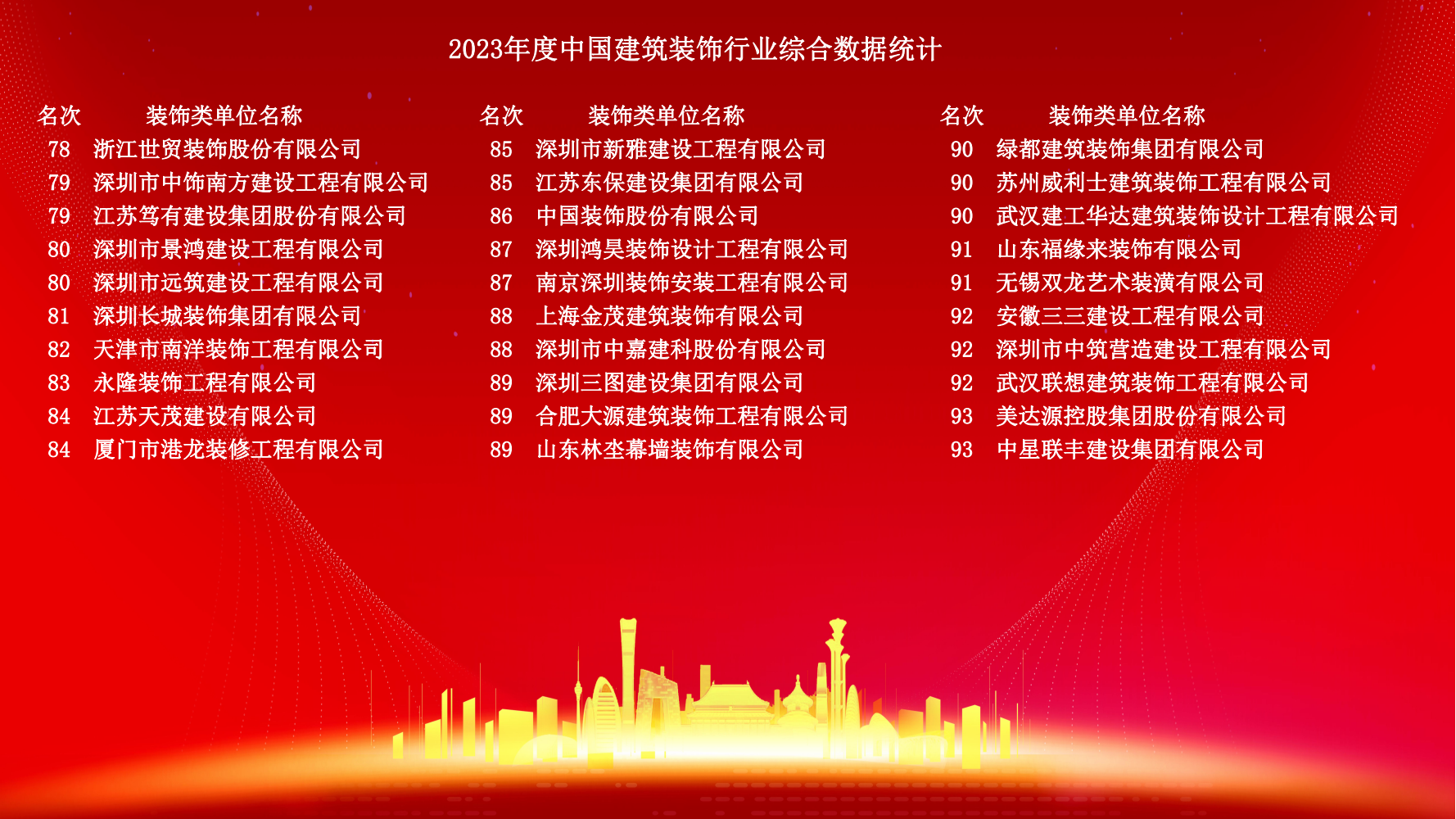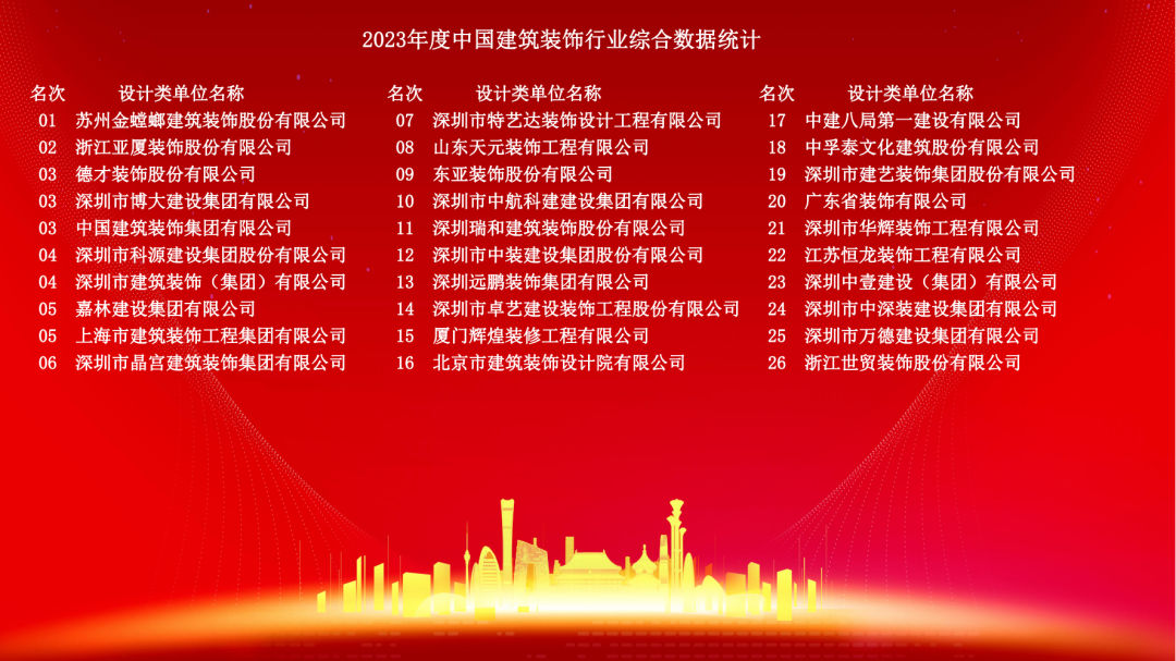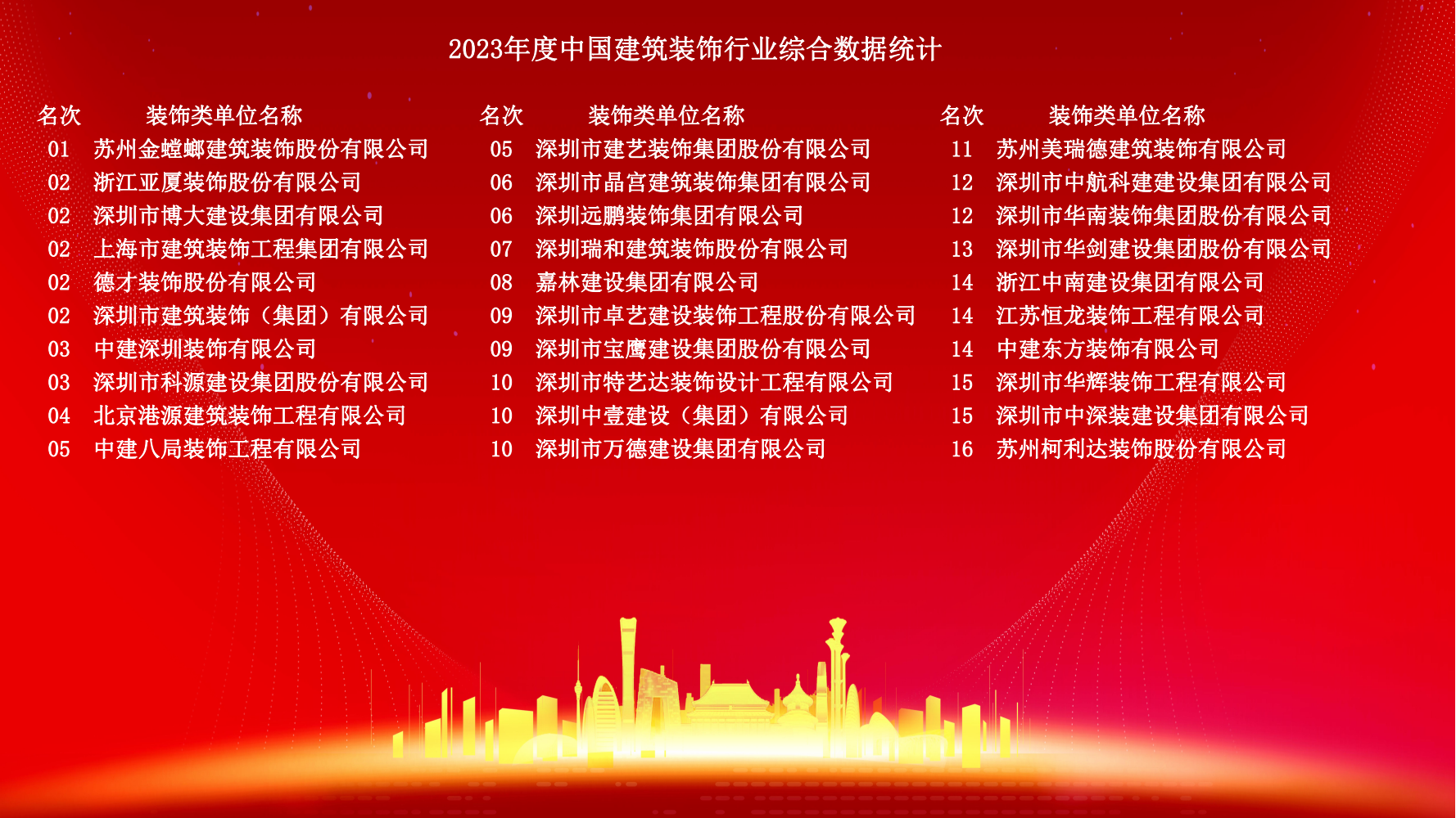 12月10日,2023年度中國(guó)建筑裝飾協(xié)會(huì)行業(yè)綜合數(shù)據(jù)統(tǒng)計(jì)正式發(fā)布。詳細(xì)名單如下: