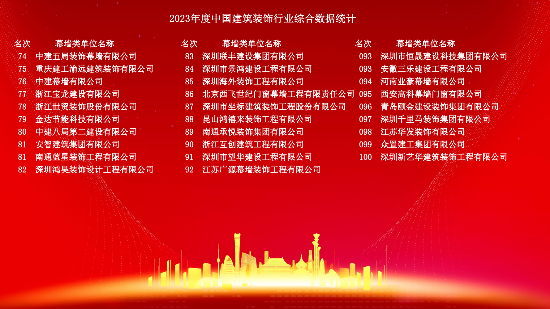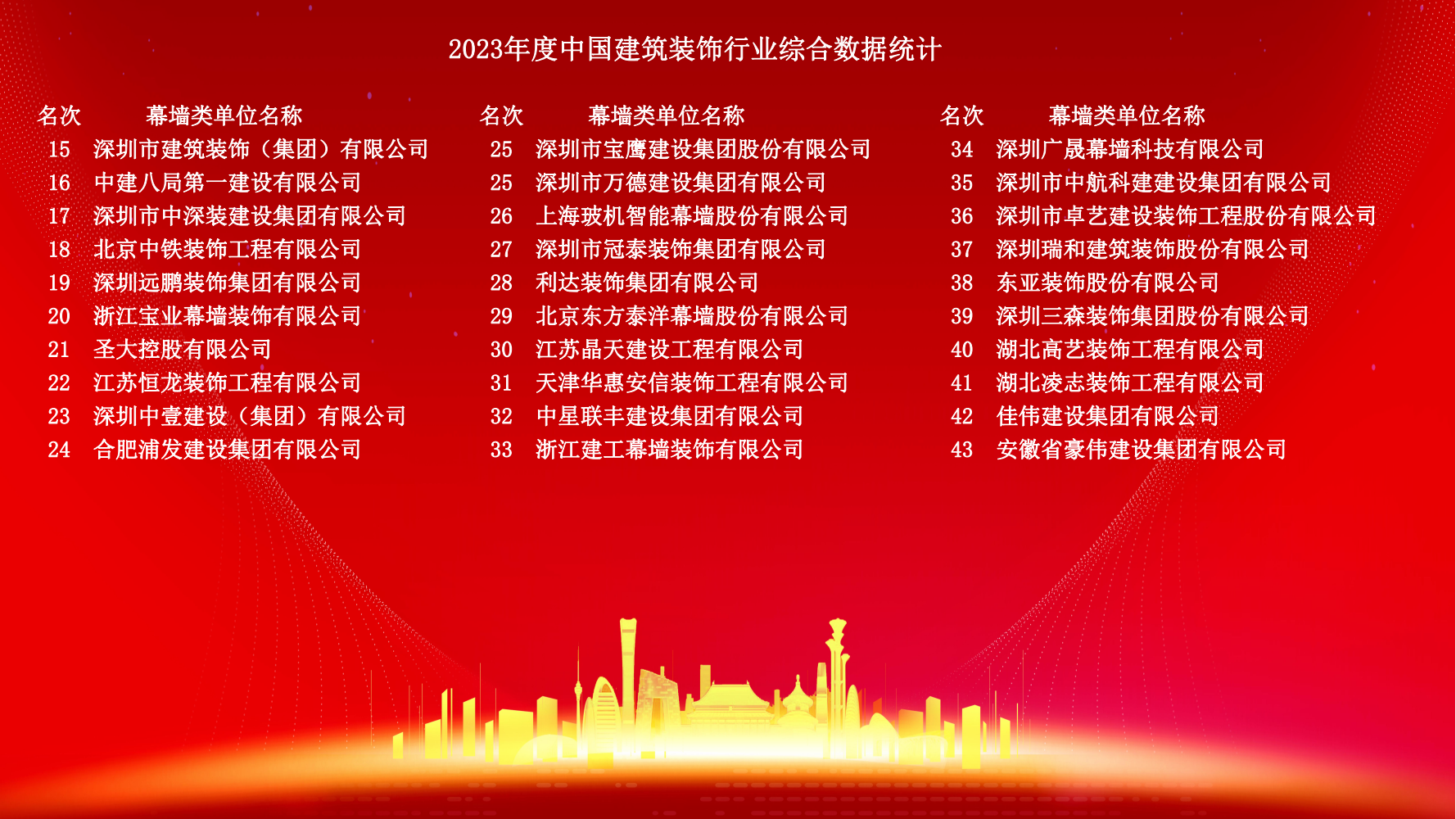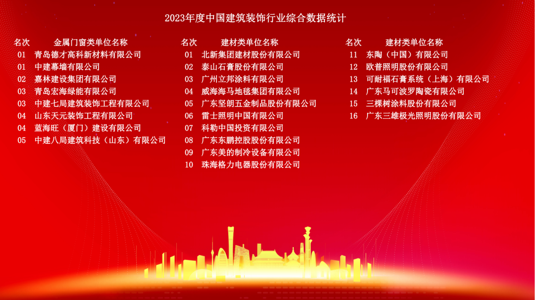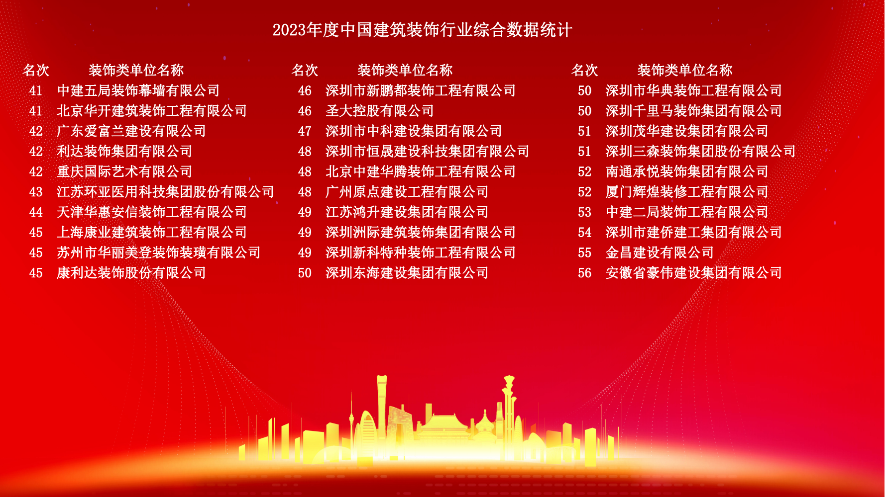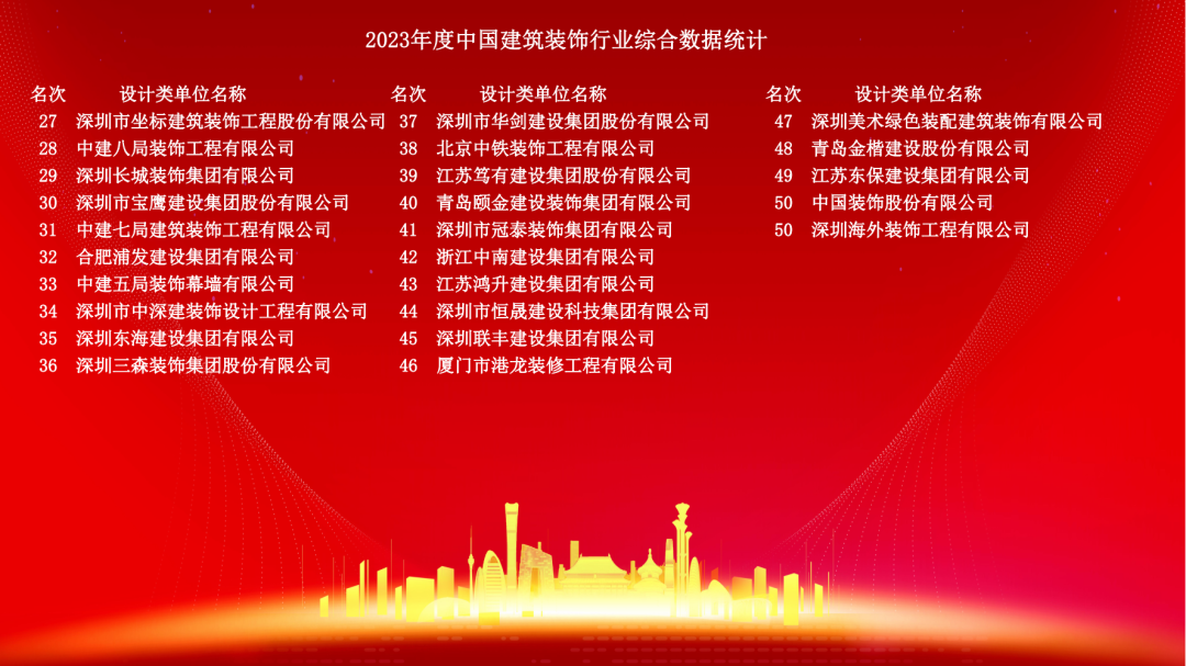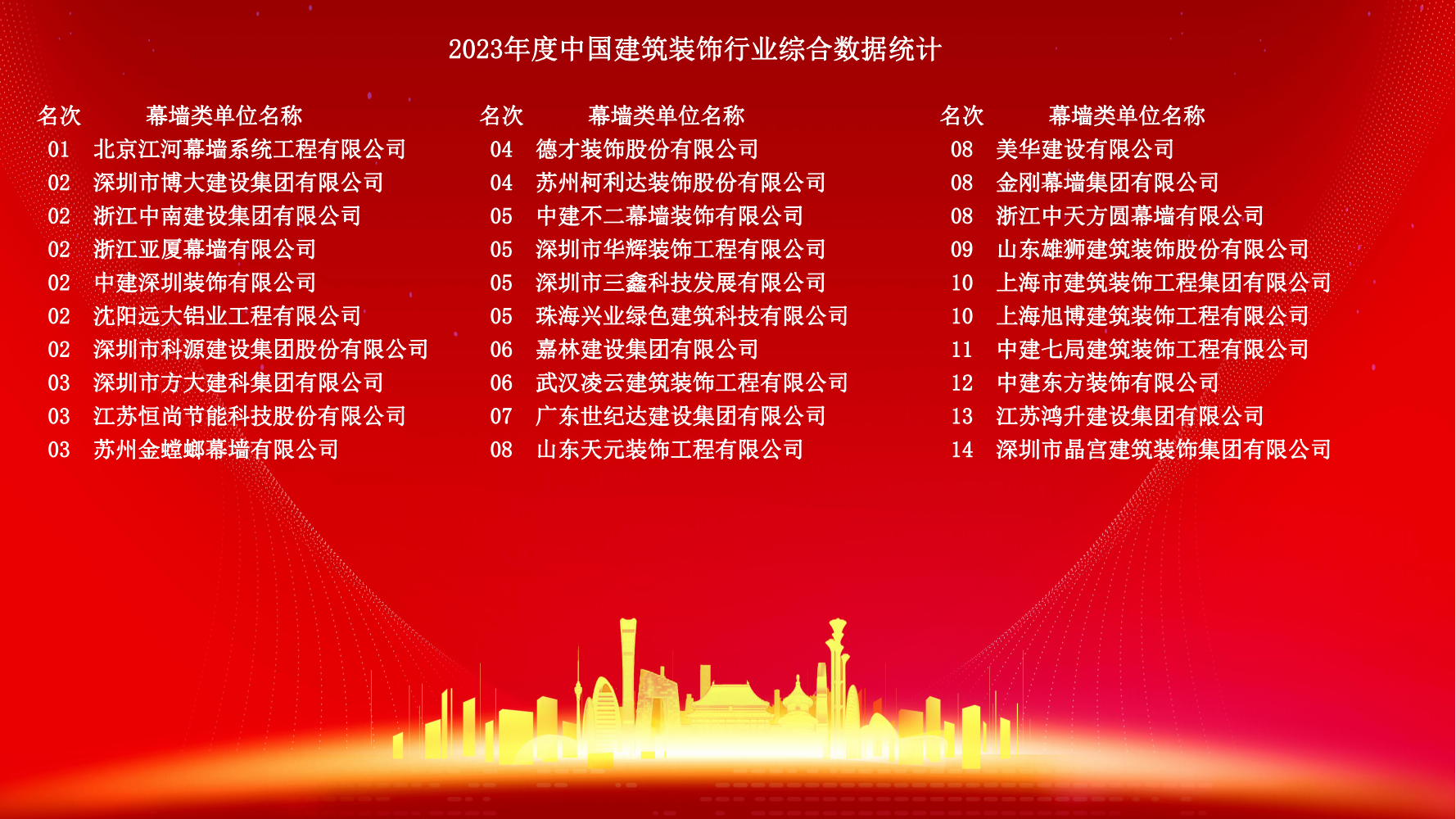 12月10日,2023年度中國(guó)建筑裝飾協(xié)會(huì)行業(yè)綜合數(shù)據(jù)統(tǒng)計(jì)正式發(fā)布。詳細(xì)名單如下: